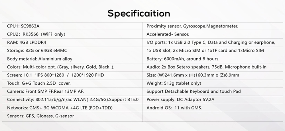 I/O ports: 1 x USB2.0 Type C, Data and Charging or earphone, 1 x USB slot, 2x Micro SIM or 1 x TF card and 1 x Micro SIM